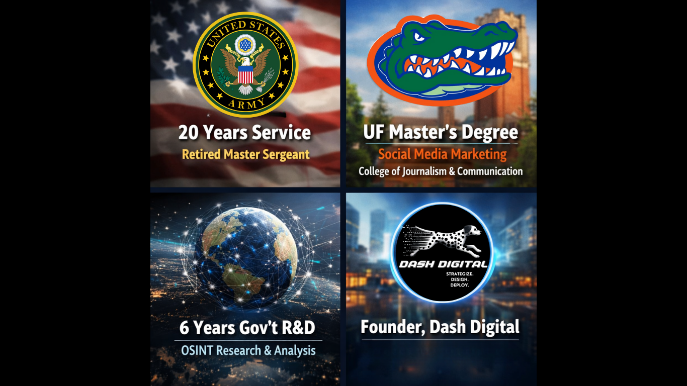 I earned my Master’s degree in Social Media Marketing from the University of Florida’s College of Journalism and Communication to combine that analytical rigor from my military experiences with modern storytelling.